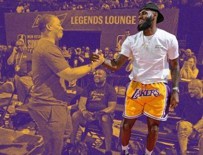 七月初,湖人夏季聯(lián)賽隊(duì)伍的首場比賽還有幾分鐘就要開始了。詹姆斯在他的安保團(tuán)隊(duì)簇?fù)硐?,信步走入拉斯維加斯的托馬斯馬克中心。他的到來瞬間點(diǎn)燃了整個球館。球迷們紛紛舉起手機(jī),攝影師們蜂擁而至。聚集在球場周圍的球員、教練和管理層人員也過來打招呼。